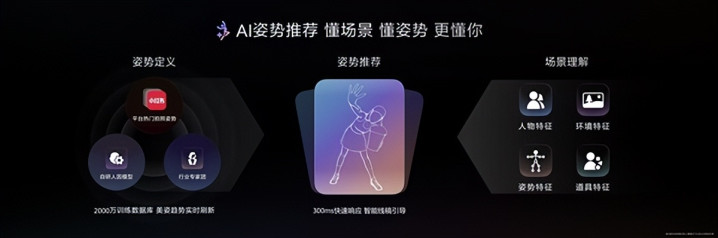 一是姿势界说,整合平台热点拍照姿势、自研东说念主因模子与行业内行团教化,基于2000万覆按数据库已毕好意思姿趋势及时刷新。二是姿势推选,以300ms快速反映速率,通过智能线稿勾通用户退换姿态。