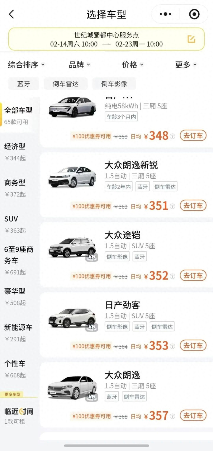 值得一提的是,与上个“五一”技巧租车价钱多量高涨情况不同,本年春节租车价钱浮动较大。以日产劲客为例,2025年“五一”技巧北京地区日租价钱约为408元(平方价钱约200元),而本年春运技巧北京日租价钱为335元,成皆业绩点价钱为353元。