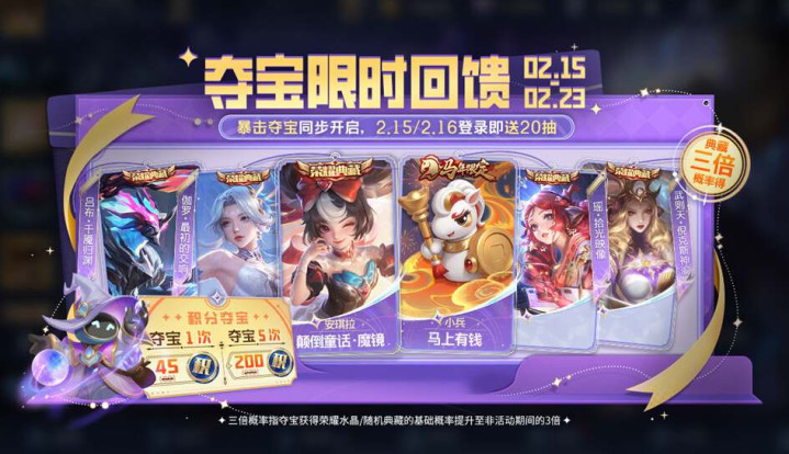 手中累积了荣耀积分或者积分夺宝抵用券的玩家不错清冷抽奖了。此次春节期间,王者荣耀依旧推出了荣耀水晶三倍概率抽取作为。