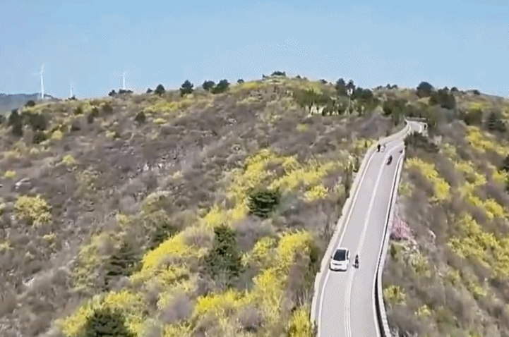 河南卫辉:漫山连翘染太行 旅客踏青打卡忙