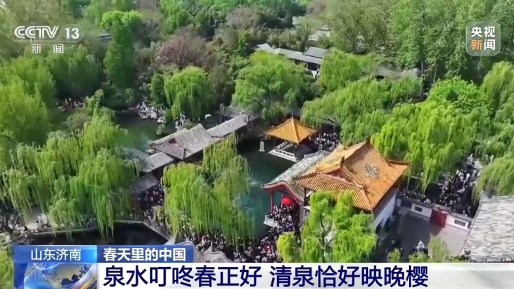 在山东济南,旅客听泉、赏花、品春色,感受独具特质的婉约韵味。