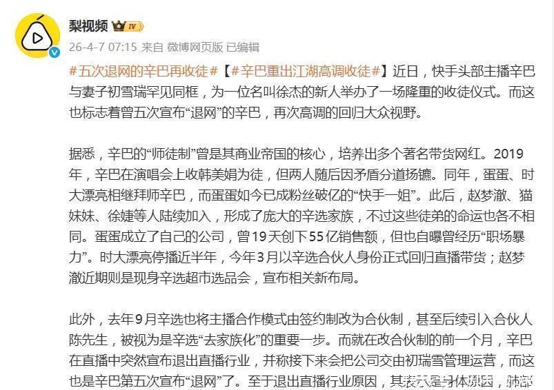 开云体育app 五次喊恒久退网!辛巴仅隔 7 月高调收徒,所谓永退全是流量脚本