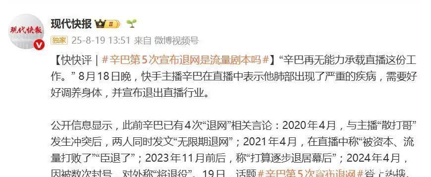 我们数数他的退网名时局:2020 年跟散打哥闹矛盾,俩东谈主全部喊无穷期退网;2021 年直播卖惨,说被成本击败喊臣退了;2023 年说要退居幕后;2024 年被封号就说要退役;2025 年 8 月拿重病当幌子,晓喻绝对退圈!